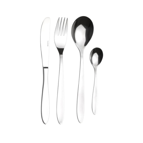 48 darabos Modell 1001 evőeszközkészlet. A készlet a következőket tartalmazza: 12x kanál 20 cm, 12x villa 20 cm, 12x kés 22 cm és 12x kávéskanál 14 cm. A Modell 1001 evőeszközök egyszerűségükkel és finom vonalaikkal tűnnek ki. Hoteleknek, éttermeknek és étkezdéknek ajánljuk. Nagyon jó árérték arány. Rozsdamentes acélból készültek. Az anyag vastagság 2,2 mm. Mosogatógépben moshatók. A tisztításukra a 014114 számú tisztítószert ajánljuk, a fényesí