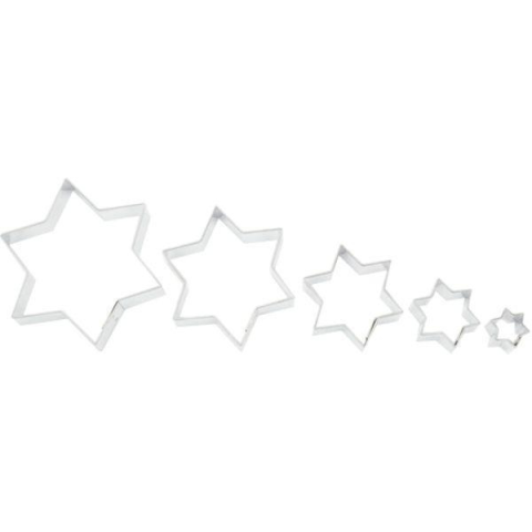 Gastro márkájú, 5 darab rozsdamentes acélból készült csillag alakú kiszúró készlet. A készletben 80 mm, 65 mm, 45 mm, 30 mm és 20 mm átmérőjű kiszúrók találhatók. Ideális karácsonyi sütemények sütéséhez és torták díszítéséhez.