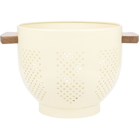 Krémszínű Gastro szűrő fa nyéllel. Ideális tészták leszűrésére vagy zöldségek leöblítésére. A szűrő átmérője 220 mm, magassága 180 mm. Minőségi anyagokból készült, élelmiszerekkel való érintkezésre alkalmas.
