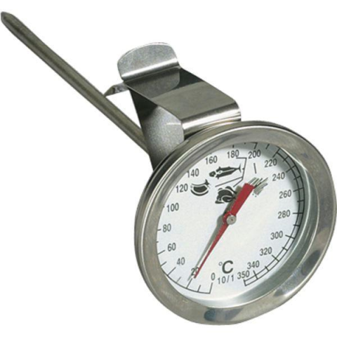 Rozsdamentes acél Gastro hőmérő fritőzökhöz, 0°C-tól 350°C-ig. Állítható csíptetővel a könnyű rögzítéshez. Alkalmas az olaj hőmérsékletének ellenőrzésére sütés közben. Ideális professzionális és otthoni használatra.
