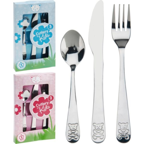 Gyerekeknek szánt evőeszköz-készlet, amely kanalat, villát és kést tartalmaz. Kék és rózsaszín változat, macis motívummal. Rozsdamentes acélból készült. Másodrendű (II. osztályú) termék, apró, kozmetikai jellegű felületi sérüléssel. Gyermekeknek szánt.