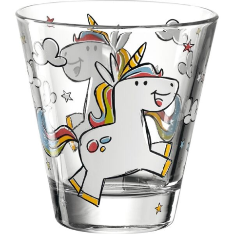 A Gastro gyerekpohár 220 ml űrtartalommal, unikornis mintával minden étkezést kellemesebbé tesz. A vidám, unikornisokkal és csillagokkal díszített dizájn ideális gyerekzsúrokhoz és a mindennapi használathoz. A Gastro pohár üvegből készült, átmérője 85 mm és magassága 90 mm.