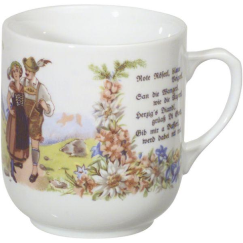 0,3 l űrtartalmú kávésbögre német közmondások motívumával. A megadott űrtartalom a bögre pereméig értendő; a használható űrtartalom kevesebb. Porcelánbögre képekkel.
