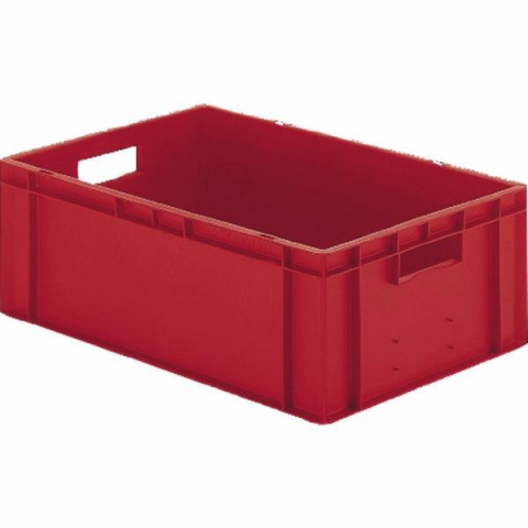 A piros Gastro műanyag rekesz, mérete 60x40x32 cm, ideális élelmiszerek szállításához. A sima belső falak megkönnyítik a tisztítást. Hőmérséklet-álló -20 °C-tól +90 °C-ig, egymásra rakható és ütésálló.