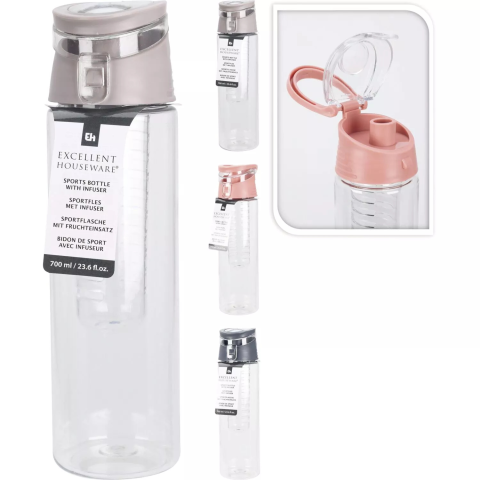 Az Excellent Houseware infúzoros sportkulacs 700 ml űrtartalommal ideális hidratáláshoz sportolás és mindennapi tevékenységek során. Az infúzornak köszönhetően gyümölcsöt vagy gyógynövényeket tehet a vízbe a felfrissülésért. A palack rózsaszín kupakja könnyen nyitható és zárható. A palack minőségi műanyagból készült.