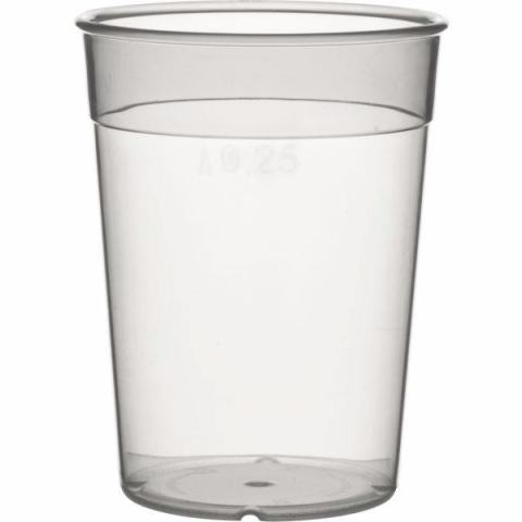 Egymásba rakható, többfunkciós, Gastro műanyag pohár, 0,25 l-nél mércével. A pohár tejesszínű, és törhetetlen. Mosogatógépben mosható. Óvodáknak, kórházaknak ajánlott, vagy akár nagyobb összejöveteleken is hasznos lehet, mint például fesztiválokon, koncerteken és vásárokon.