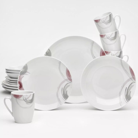 »Tonga«kerek forma, megemelt peremfehér színű, szürke, rózsaszín és bordó színű dekoratív szegéllyelporcelán, mosogatógépben mosható és mikrohullámú sütőbe tehető