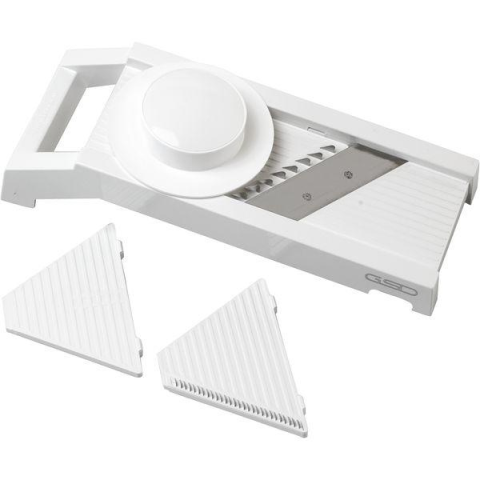 Gastro Fino zöldségszeletelő, 3 különböző tartozék, állítható vastagság, tömör műanyag keret, kések rozsdamentes acélból, markolat a biztonságos vágás érdekében, nagyon egyszerű kezelés, könnyen és gyorsan vághat gyümölcsöt vagy zöldséget vele.