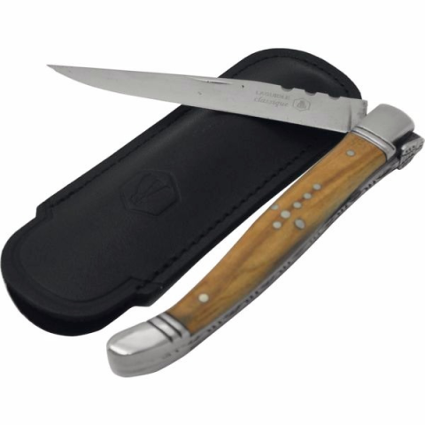 A Gastro Laguiole zsebkés olívafa markolattal. Fekete bőrtokkal szállítva. A kés a gasztronómiai eszközök magas minőségének és megbízhatóságának jelképe. Acélpengével.