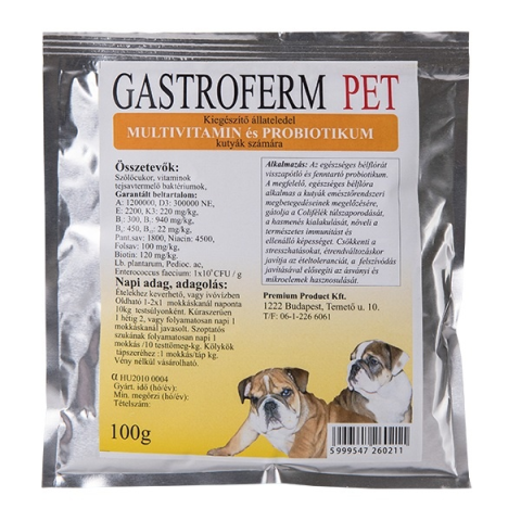 Gastroferm Pet Multivitamin és probiotikum kutyák számára Az egészséges bélflórát visszapótló és fenntartó probiotikum. A megfelelő, egészséges bélflóra alkalmas a kutyák emésztőrendszeri megbetegedéseinek megelőzésére, gátolja a Colifélék túlszaporodását, a hasmenés kialakulását, növeli a természetes immunitást és ellenálló képességet. Csökkenti a stressz hatásokat, étrendváltozáskor javítja az ételtoleranciát, a felszívódás javításá