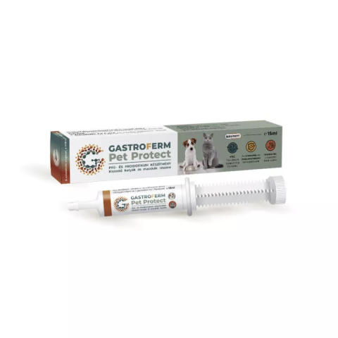 Gastroferm Pet Protect 15 ml- Kistestű kutyáknak és macskáknakA védelem belülről kezdődik: támogassa kedvence egészségét a Gastroferm Pet Protect 15 ml komplex összetételű, ízesített szimbiotikum pasztával!A terméket 5 kg alatti kutyák és macskák részére ajánljuk!A könnyen adagolható, paszta formában elérhető készítmény pre
