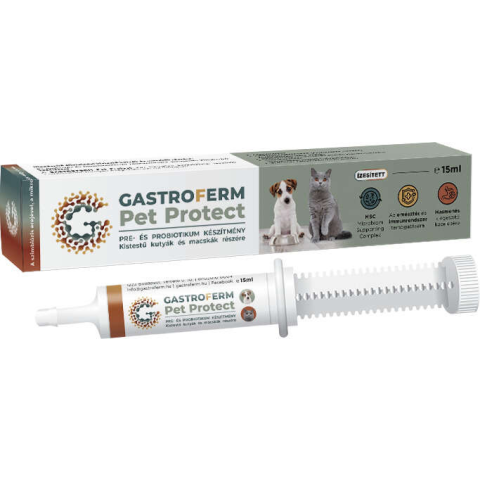 A Gastroferm Pet Protect könnyen adagolható, paszta formában elérhető készítmény prebiotikus összetételének köszönhetően támogatja az immunrendszer működését (Inulin, Fos, Mos, béta-glükán) és a probiotikumok pedig segítenek helyreállítani és megóvni az emésztőrendszer állapotát. Tartalmaz gyomor és bélnyálkahártya védő anyagokat, valamint Glutamin tartalmával elősegíti a bélhámsejtek regenerációját. Stresszhelyzetek és megbetegedések e