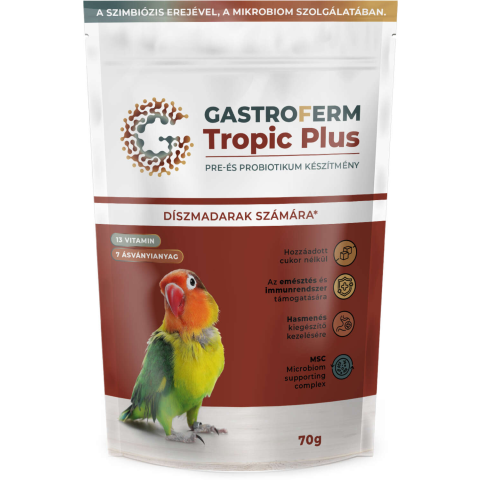 A Gastroferm Tropic Plus a díszmadarak igényeinek megfelelően kifejlesztett komplex összetételű szimbiotikum vitaminokkal, ásványi anyagokkal és aminosavakkal. Könnyen adagolható, por formában, hozzáadott cukor nélkül nyújt segítséget a különféle stresszhelyzetek esetén, valamint az emésztés és az immunrendszer támogatásában, illetve a hasmenés kiegészítő kezelésében. A készítményben található probiotikumok támogatják, regenerálják a bél mikrofl