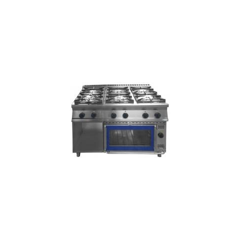 Gáztűzhely 6 égővel, GN 2/1 elektromos sütővel, zárt tárolóval, a 900-as szériából. Égők teljesítménye:3x5,3, 3x8,3 kW. Sütő teljesítmény:3,5 kW. Elektromos csatlakozás: 230 V. Összteljesítmény 40,8 kW.
