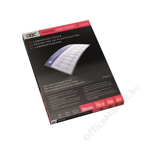 Meleglamináló fólia, 75 mikron, A4, fényes, GBC High Speed (GBC3747347) A4-es dokumentumokhoz vastagság: 2x75 mikron felület: fényes használata A3-as laminálógéppel (hosszabb oldala mentén laminálható) kiszerelés: 100 db/csomag Gyártó/első EU forga