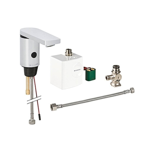 Geberit 186 álló automata mosdócsaptelep generátorral, külső keverőszeleppel 116.366.21.1 Hideg és melegvíz csatlakozáshoz Vezetékes víz elvételéhez Közterületeken és közösségi helyiségekben való alkalmazásra Mosdóasztalba vagy munkalapba való beépítésre