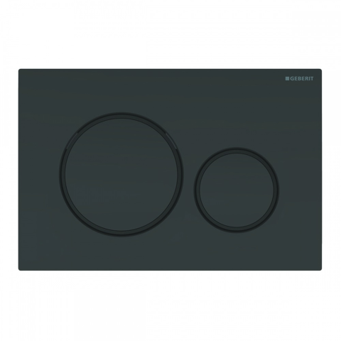Vezérlőgomb fekete műanyagból, fekete matt gyűrűkkel a gombok körül. A gomb csak a Geberit Sigma modulokkal kompatibilis, a Geberit Delta modulokkal nem kompatibilis.