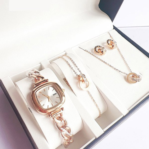 Óra ajándékcsomag - női, analóg idő megjelenítés, szögletes számlap, elegáns, számozás nélküli, tok anyaga alumínium, tok színe rózsaarany, szíj színe rózsaarany, nyaklánc, fülbevaló és karkötő szintén a csomagban The GEDI GD2001 Pink gift set combines a ladies analogue watch with a finely tuned jewellery set in a uniform rose gold finish. The watch with a square dial has a metal alloy case and strap with IP pl