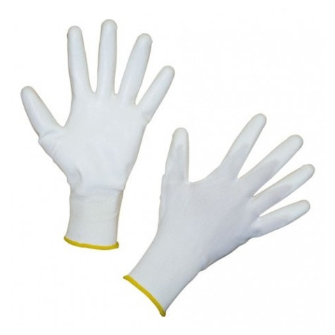 Munkavédelmi kesztyű fehér 10“Félig mártott nylon kesztyű poliuretán réteggel a tenyérnél és az ujjaknál, ellasztikus kötéssel a csuklónál.Technikai paraméterek:Méret: 10“Kopásálló