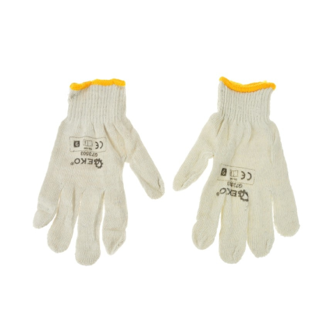Munkavédelmi kesztyű, kötött 9“ NATURAL Kötött munkavédelmi kesztyű 9“ NATURAL, használatható száraz, pormentes környezetben pl. elektromos fogyasztók és mehanikus berendezések szétszerelésénél, javításánál . Varrás nélküli technológiával készült, rugalmas kötött anyagból a csuklónál. Technikai paraméterek:Méret: 9“