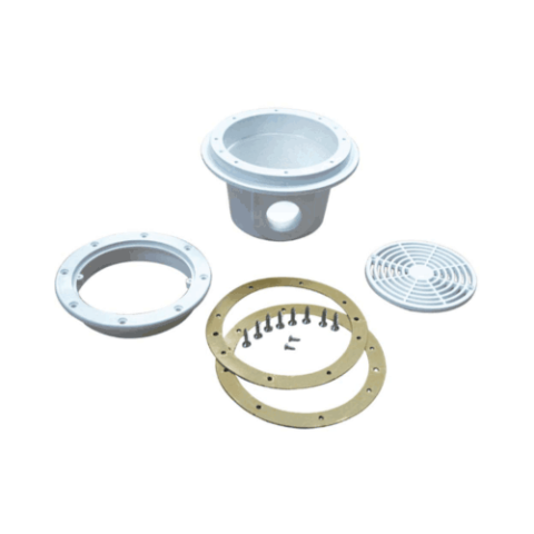 Fehér színű, kör formájú fóliás fenékürítő fóliás medencékhez. ABS műanyagból, tömítéssel készült, rozsdamentes csavarokkal.