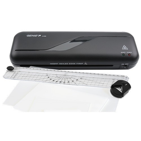 Laminálógép GENIE 4in1 Set LA 200, fekete Otthoni használatra vagy kisebb irodákba ajánlottFelfűtési idő: 4 percLED állapotjelző fényMaximális méret: A4Fóliavastagság: 80 / 125 mikronSzett tartalma: LA 200 laminálógép, 50 db fólia, sarokkerekítő, vágós