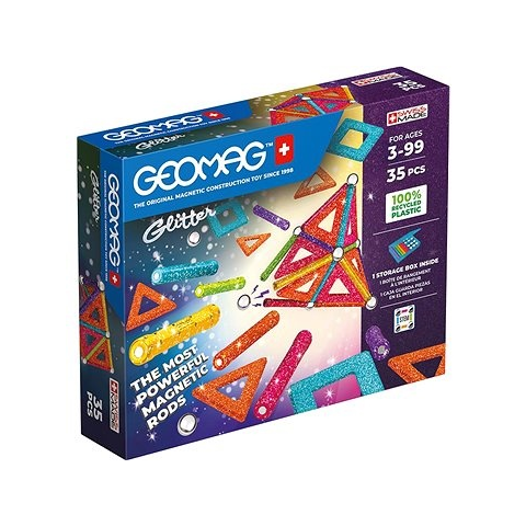 Építőjáték - 35 darabos készlet, téma formák, anyaga műanyag, mágnes és fém, ajánlott 3 éves kortól A Glitter Recycled 35 építőelem legfontosabb jellemzői3 éves, vagy annál idősebb gyerekeknek tervezték100%-ban újrahasznosított műanyagból készült35 darab a csomagbanCsillám a rudakban és a kitöltőlem