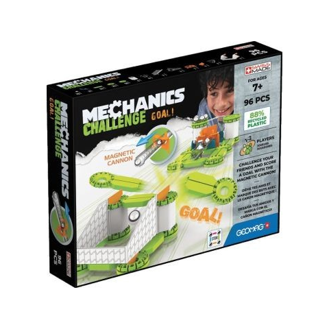 Geomag Mechanics: Challenge Goal! mágneses építőjáték készlet - 96 db-os. A készlet segítségével a gyerekek egy kilövőt, kaput, forgó akadályt és sorfalat építhetnek. A Geomag szett is szinte teljes egészében (88%) újrahasznosított műanyag felhasználásával készült. Csomagolás mérete: 27 x 21 x 5 cm