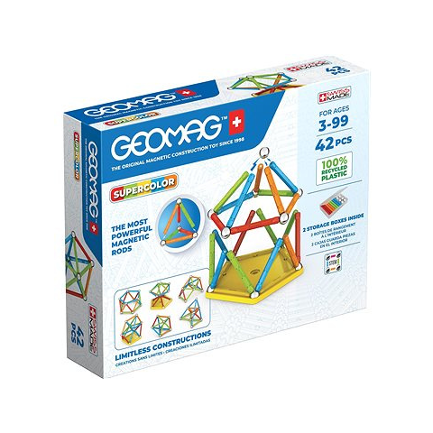 Építőjáték - 42 darabos készlet, téma formák, anyaga műanyag, mágnes és fém, ajánlott 3 éves kortól A Geomag Supercolor újrahasznosított, 42 darabos építőjáték főbb jellemzői3 éves kortól ajánlott100% újrahasznosított műanyagból, mágnesből és fémből készült35 darabos készletA csomagolás praktikus át