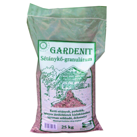 Gardenit sétánygranulátum lila színben. Gyorsan szikkadó, dekoratív kőzetzúzalék, több színben, kerti sétányok, parkolók, térszínének kialakításához. 25 kg-os zsákban. Szemcseméret: 4-8 mm.