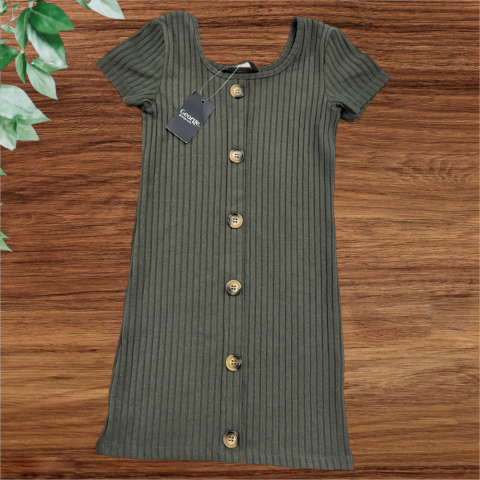 Csini gombos ruha Egyenes szabású, kerek nyakú, elején díszgombokkal. Kellemes gépi kötött anyag, sztreccses. mell:2x28m hossz:62cm Új, címkés termék.