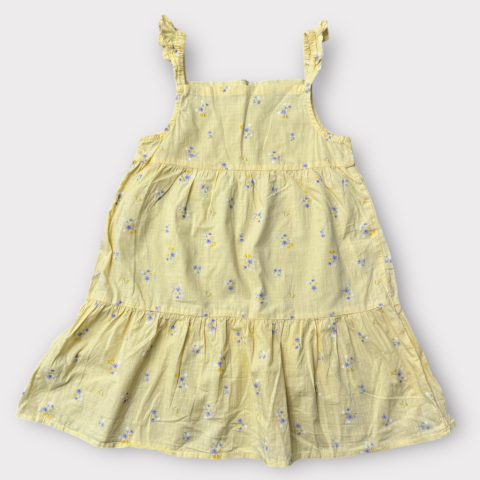 Halvány sárga, virágos ruha Kissé bővülő szabású, vállpántja fodros. Hibátlan állapotú.