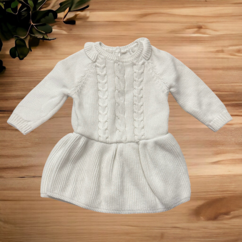 Hófehér kötött ruha Egyenes szabású, kerek nyakkivágású, hátán gombos. Kellemes kötött, pamut anyag. Hibátlan állapotú.