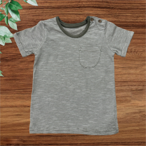 Keki csíkos póló Egyenes szabású, kerek nyakkivágású, vállnál gombos, elején zsebes. Kellemes és kényelmes pamut anyag. Hibátlan állapotú.