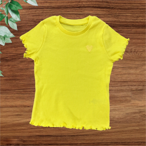 Sárga szívecskés felső Egyenes szabású, kerek nyakkivágású, ujja és alja fodros. Elején hímzett szívvel. Kellemes pamut anyag. Hibátlan állapotú.