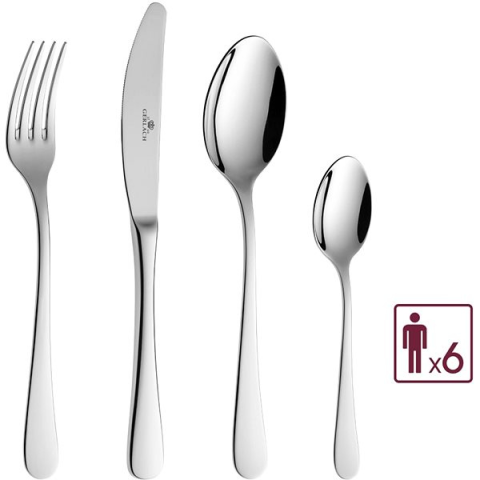 Evőeszközkészlet - étkezővilla, étkezőkés, étkezőkanál és teáskanál, fényes felületkezelés, alkalmas mosogatógépbe, rozsdamentes acél, 6 készlet összesen 24 db evőeszközzel A modern Gerlach FLOW evőeszközkészlet 24 db leglényegesebb tulajdonságai E praktikus GERLACH evőeszköz készlet az étkezés egyik nélkülözhetetlen tartozéka A csomag tartalma: étkezővilla, étkezőkés, é