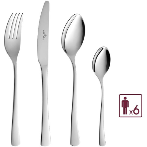 Evőeszközkészlet - étkezővilla, étkezőkés, étkezőkanál és teáskanál, fényes felületkezelés, alkalmas mosogatógépbe, rozsdamentes acél, 6 készlet összesen 24 db evőeszközzel E praktikus Gerlach TUNEA evőeszközkészlet 24 db legfontosabb tulajdonságai E praktikus GERLACH evőeszköz készlet az étkezés egyik nélkülözhetetlen tartozéka A csomagban a következők találhatók: étkez