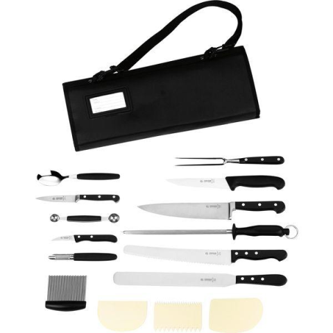 Késkészlet táskában, 15 részes, készlet tartalma: 1x tasak, 1x 23 cm konyhakés széles kovácsolt pengével, 1x 16 cm szúrókés, 1x univerzális fogazott kés, 1x 10 cm metszőkés, 1x 6 cm zöldségkés, 1x 28 cm cukrászkés, 1x hámozó, 1x díszítőkés, 1x köszörűkő kerek pengével, 1x 15 cm villa, 1x kanál, spatulák