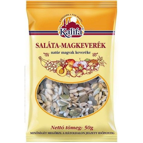 Kalifa saláta magkeverék 50 g Saláta-magkeverék: napraforgómag, tökmag, és fenyőmag keveréke.Ha a már megszokott salátákat szeretné egy kicsit feldobni akkor erre kíválóan alkalmas ez a magkeverék, továbbá gazdagíthatjuk vele mártásainkat, különlegessé