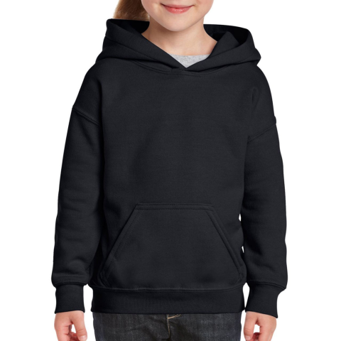 Kapucnis gyerekpulóver kenguruzsebbel, Gildan GIB18500, 271.0 g/m2 (White 257 g/m2) 50% pamut / 50% poliészter Air jet fonal = puhább tapintás és bolyhosodás mentes Dupla tűzésű kapucni Kitéphető címkére váltás folyamatban Dupla tűzésű derékrész, vállrés