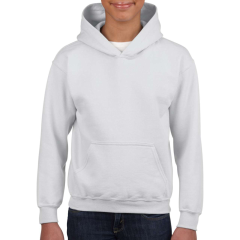 Kapucnis gyerekpulóver kenguruzsebbel, Gildan GIB18500, 271.0 g/m2 (White 257 g/m2) 50% pamut / 50% poliészter Air jet fonal = puhább tapintás és bolyhosodás mentes Dupla tűzésű kapucni Kitéphető címkére váltás folyamatban Dupla tűzésű derékrész, vállrés