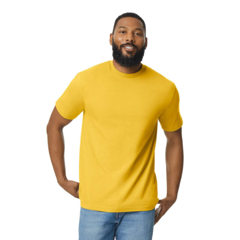 Klasszikus szabású körkötött póló, Gildan GI65000, 100% gyűrűsfonású pamut, 183,0 G/SqM (fehér 180,0 G/SqM) A puha, gyűrűsfonású pamutból és pamutkeverékekből készült Softstyle nagy öltéssűrűségű szövet, sima nyomtatási felületet biztosít Klasszikus s