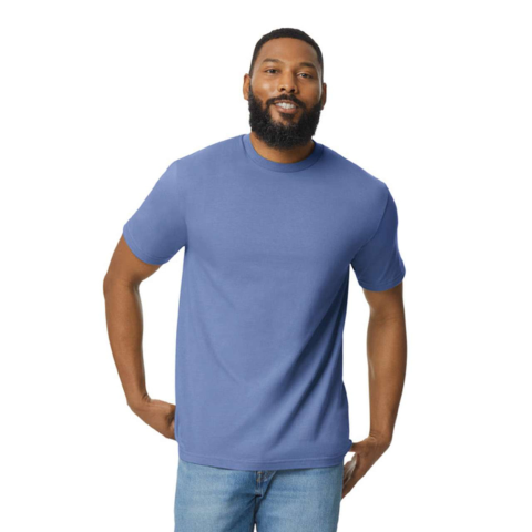 Klasszikus szabású körkötött póló, Gildan GI65000, 100% gyűrűsfonású pamut, 183,0 G/SqM (fehér 180,0 G/SqM) A puha, gyűrűsfonású pamutból és pamutkeverékekből készült Softstyle nagy öltéssűrűségű szövet, sima nyomtatási felületet biztosít Klasszikus s