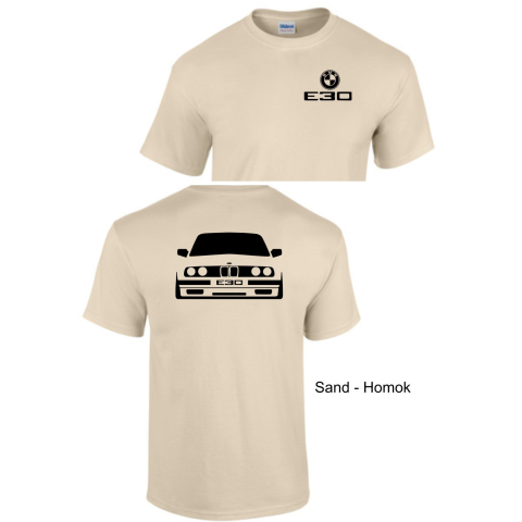 BMW E30 kereknyakú pamut póló 100% pamut, uniszex póló BMW autós mintával. körkötött, környakas, rövid ujjú anyaga 100% pamut 185 g/m2 (175 gr/m2 fehér) S-3XL méretekig választható varrás nélküli, duplán tűzött nyakkivágás válltól-vállig pántos kitéph