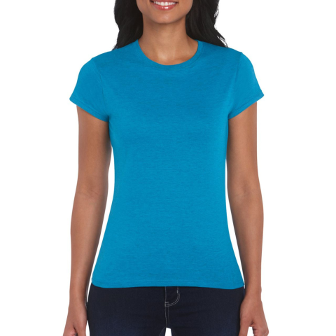 Softstyle testhez álló rövid ujjú női póló, Gildan GIL64000, 153.0 g/m2 (White 144.0 g/m2) 100% gyűrűs fonású pamut Pamut/poliészter keverék egyes színek esetében Testhez álló, oldalvarrott Simább nyomási felület a magas öltéssűrűségnek köszönhetően
