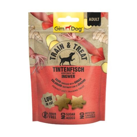 A GimDog Train & Treat Tintenfisch & Ingwer snack egy minőségi jutalomfalat tintahallal és gyömbérrel kutyák részére.