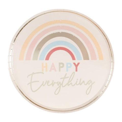 Party papírtányér (8 db) szett “Happy Everything” felirattal, szivárvány és arany színben Stílusos party – stílusos kiegészítők! A szülinapi zsúrok és babaváró bulik elengedhetetlen kelléke az ízléses, dekorációval harmonizáló papírtányér készlet. Ebben a