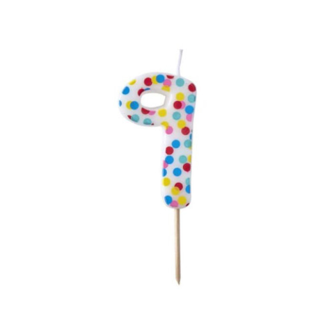 Színes pöttyös számos tortagyertya A szülinapi zsúrok és bulik elengedhetetlen kelléke a szülinapi tortára való számos gyertya. Ebben a csomagban a 9 szám található. A színes pöttyökkel dekorált gyertya minden tortát feldob akár kisfiú, akár kislány az