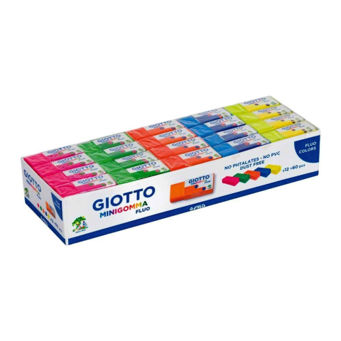Radír GIOTTO mini gomma fluo színek Radír Giotto Mini Gomma. Mérete: 3,8x1,5x1,6 cm. Por,- ftalát,- és PVC mentes. Egyedileg csomagolva EAN számmal ellátva. 5 fluo (fuxia, sötétkék, sárga, zöld, narancssárga).