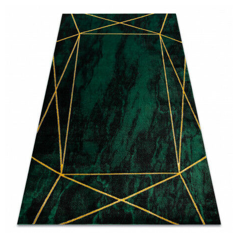 Elegáns Zöld-Arany Geometriai Szőnyeg - 160x220 cm Ez a gyönyörű szőnyeg feldobja otthonod eleganciájával és modern geometriai mintájával. A mély smaragdzöld és a finom arany kombinációja luxus érzetet kölcsönöz a térnek. A márványhatású felület külö...
